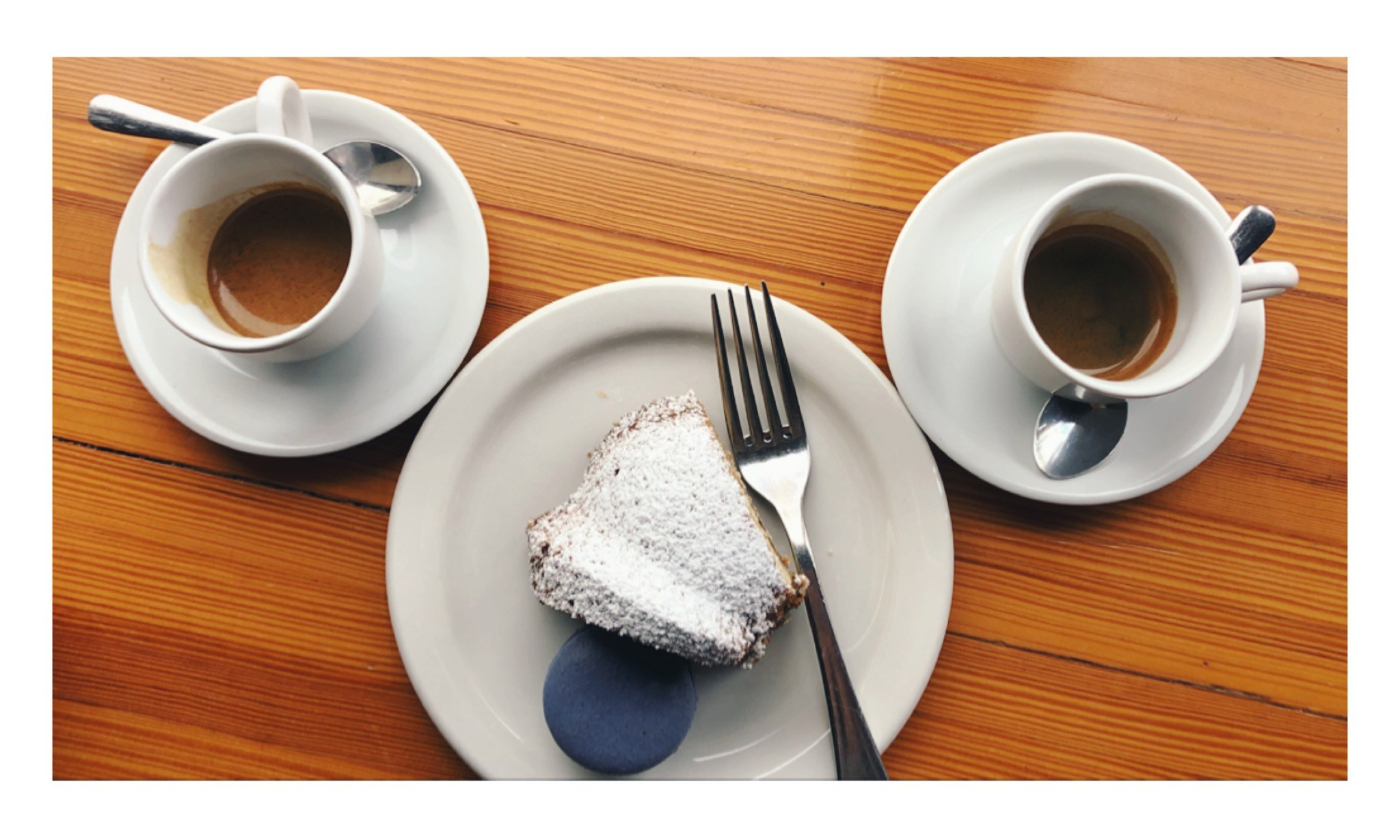 Espresso with coffee cake and earl gray macaroon